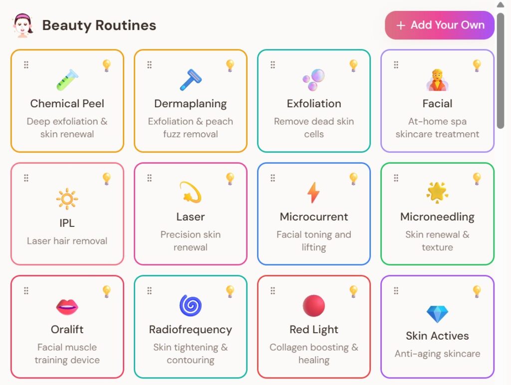 - Discover New Treatments – Each routine has details about the value of the treatment and recommended frequency