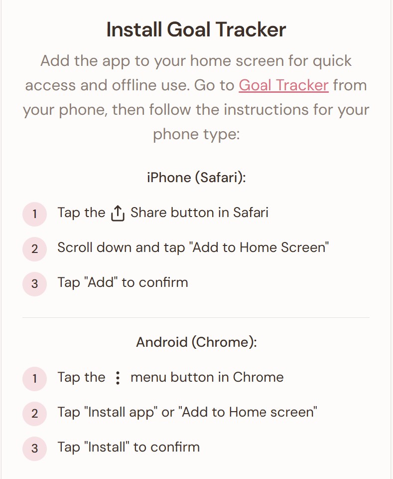 - Track Your Progress – Log each completed session and watch your consistency grow over time as you accomplish your goals